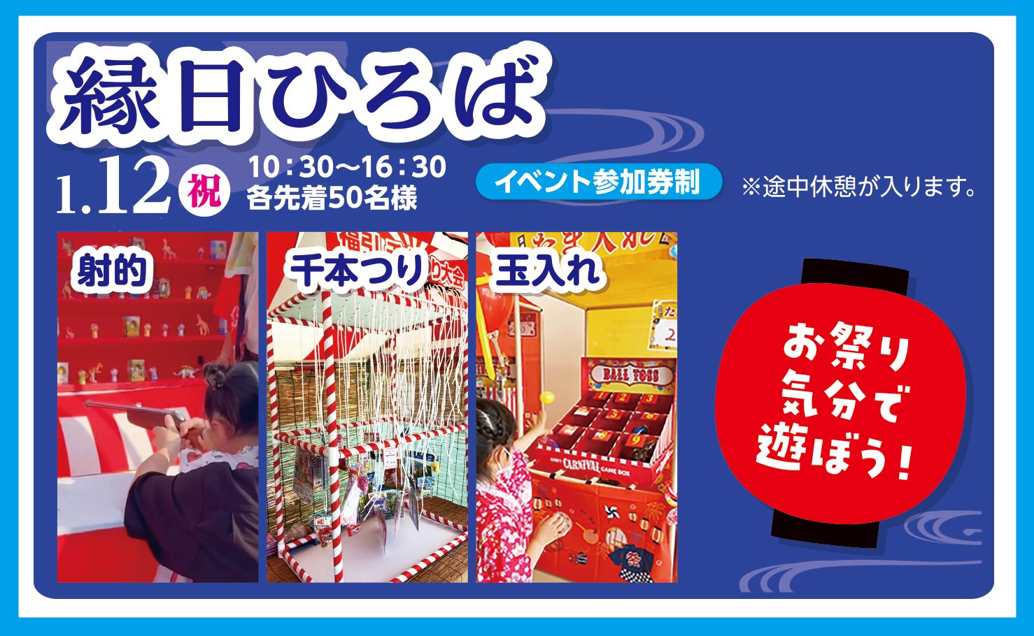 【2026年1月12日(祝)】縁日ひろば 2025年12月23日 最終更新日時 : 2025年12月23日 child お祭り気分で遊ぼう! ●日程:1/12(祝)●時間:10:30~16:30●参加:各先着50名様・イベント参加券制 ※途中休憩が入ります。