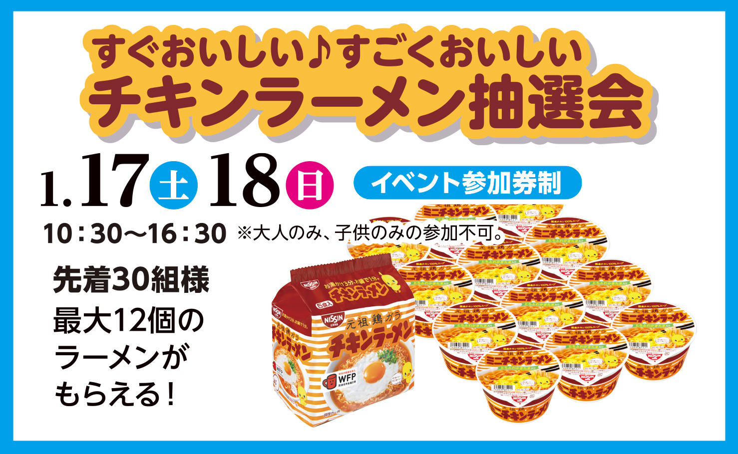 【2026年1月17日(土)・18日(日)】すぐおいしい♪すごくおいしい チキンラーメン抽選会 2025年12月23日 最終更新日時 : 2025年12月23日 child 最大12個のラーメンがもらえる! ●日程:1/17(土)・1/18(日)●時間:10:30~16:30●参加:先着30組様・イベント参加券制 ※大人のみ、子供のみの参加不可。